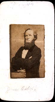 The predecessors of cartes de visite were calling cards. During the 1850s, it was the custom to present one’s calling card at the time of a social visit. These cards were smaller than today’s business cards, frequently consisting of a name engraved and printed on glossy stock; in later years, designs became more elaborate. Families would often provide decorative baskets or trays to receive calling cards from visitors. During the 1850s, there were sporadic reports of photographers in the U.S. or Europe preparing photographic calling cards, in which the portrait replaces the engraved name. The example shown here is a rare survivor: a salt print 1-7/8 inches tall on glossy card stock, 2″ x 3-1/4″. Other early salt print calling cards vary in size.